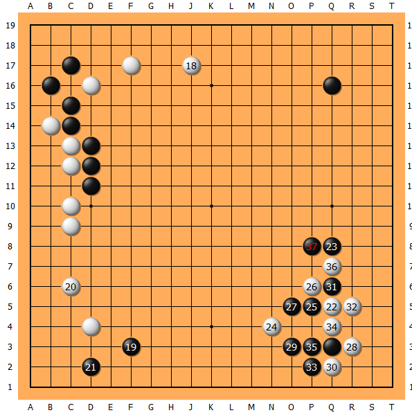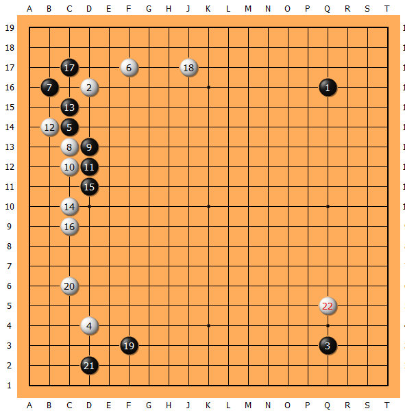 假若老实的按部就班,则白棋右下率先动手。战斗好坏且不论,深感局面主动性已落入白棋手中。于是。。。
