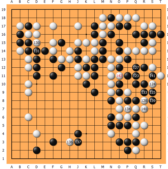 冷静下来之后摇了摇头,无奈127只得进行打劫。庆幸的是本身劫颇多,缓解了一丝压力。也令我意识到在这么紧要的关头,任何时刻都不能轻易放松。以下打劫再次将局面搅乱。