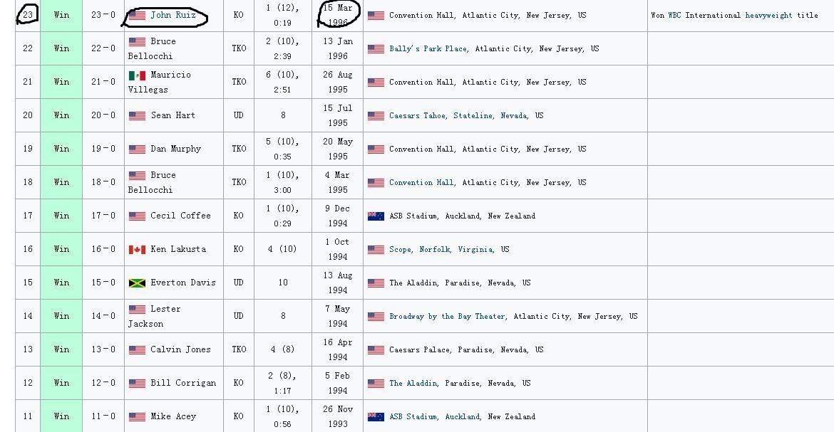 1996年在自己的首场洲际头衔战中,一回合秒杀了鲁伊兹,成为了WBC国际拳王,只可惜之后输给了伊比布奇,这场比赛也是拳坛中非常经典的对决,一直被拳迷们津津乐道。