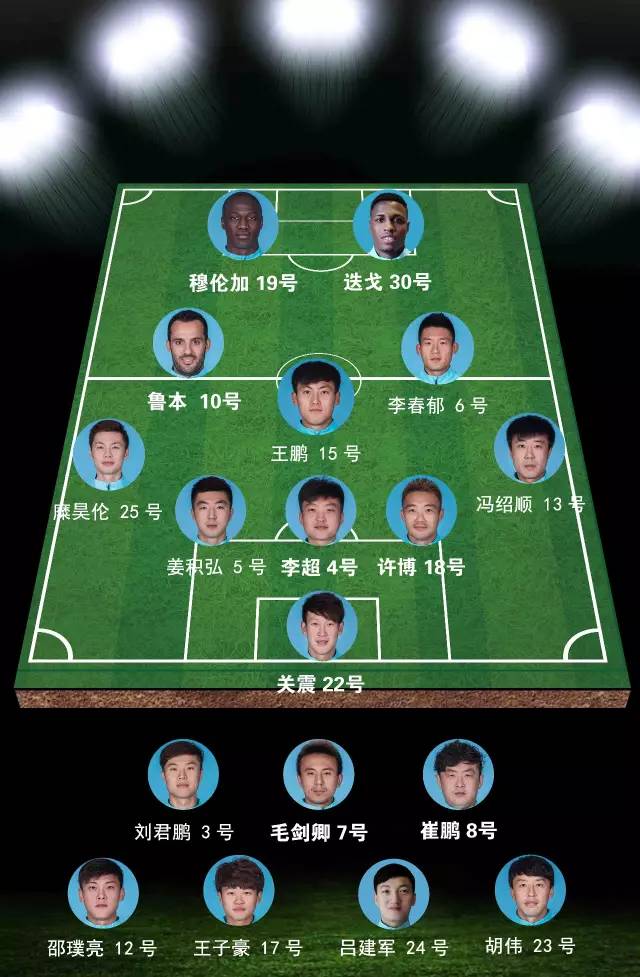 我方首发: 22-关震、25-糜昊伦、5-姜积弘、4-李超、18-许博(11‘ 3-刘君鹏)、13-冯绍顺、10-鲁本(21’7-毛剑卿)、15-王鹏、6-李春郁、19-穆伦加、30-毛里西奥(92' 8-崔鹏)