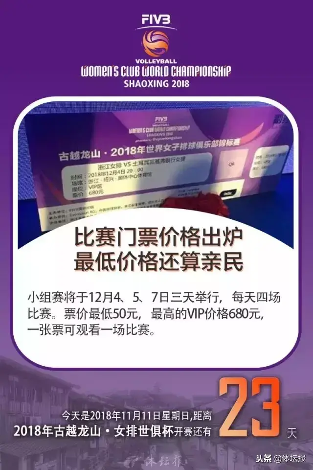 女排世俱杯将于12月4-9日在浙江绍兴举行,地点是绍兴奥体中心。近日浙江体育局和绍兴市人民政府召开新闻发布会,世俱杯小组赛的票价出炉。