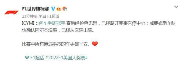 7月4日,该微博发布消息称周冠宇赛后经检查无碍,已经离开赛事医疗中心。