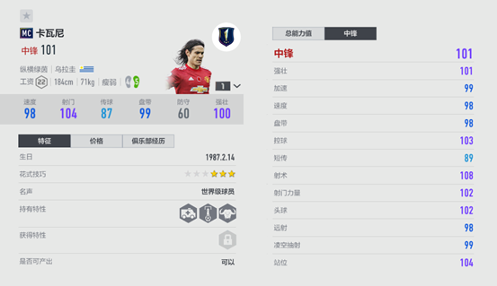 之前在FIFA ONLINE 4中的卡瓦尼虽然强度不弱,但始终难以进入顶尖行列。然而MC赛季的出现让他一跃成为了巴黎套玩家的中锋必备人选:单卡高达108的射术赋予他最顶尖的终结能力,102的头球属性再配合强力头球的特性则是现实能力的完美写照。只要把球传到中路,禁区内巴黎圣日耳曼队史射手王绝不会让你失望。