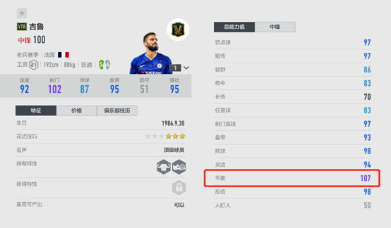 有些人可能不知道身高192体重88kg是什么概念,我们一般称这种人为模型怪,而吉鲁就是这样的顶级模型拥有者。有些玩家朋友会诟病他的速度不够快,但是吉鲁本身的作用就并非是追直塞而是前场的支点与桥头堡,如此模型配合高达107的平衡,护球键一按,称得上是法国神塔、后卫叹息之柱。