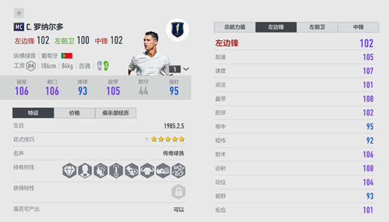 MC赛季的C罗无疑是他的最强赛季卡。之前的赛季更多将他定义为终结者,虽然速度超群射术溢出,但传球能力相对较弱。而此次的默认位置为左边锋,因此在终结能力依然强势的前提下大幅提升了传中等属性,可边可中的他是没有短板的存在,这张卡虽无传奇之名,但在小编看来已有传奇之实。