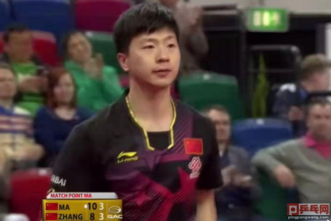 张继科发中路长球,马龙正手抢冲出界,张继科10-6拿到局点。