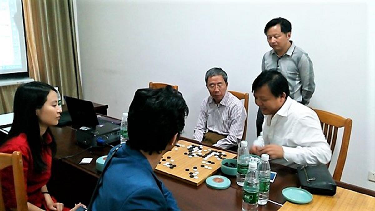 华以刚八段和陈盈初段探讨棋局,他们在景德镇学院挂盘讲解了这盘棋