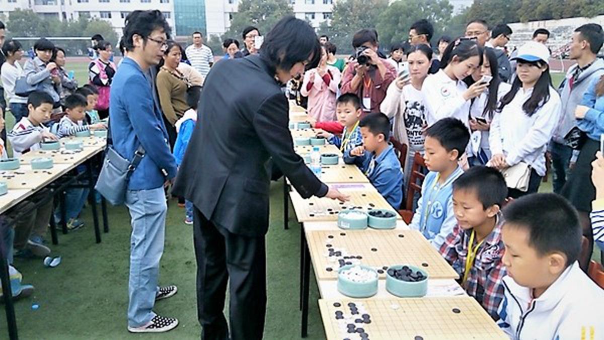 出了讲解现场,就赶往多面棋现场。景德镇学院的操场也是人山人海,主席台广播及时通报“欢迎世界冠军李世石九段来到现场”,李世石就被围在人群里合影又是签名。现场约20台多面棋,李世石下其中的约8盘,每盘下了约10手。这时李世石的脸上难得绽出了“快乐围棋”的笑容。而和江维杰复盘时,笔者简直以为输棋的是他呢?