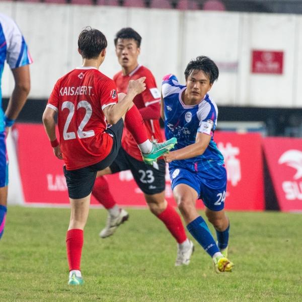 2024年,陈哲宣(右)租借加盟中甲球队石家庄功夫。5月18日,陈哲宣亮相娄底市体育中心,在同湖南湘涛的足协杯比赛中首发登场。摄影/张惠
