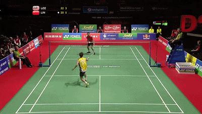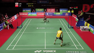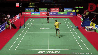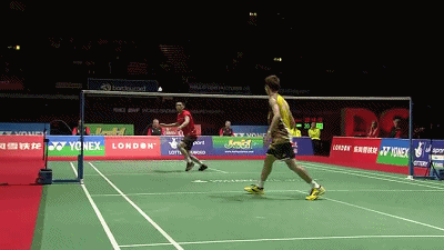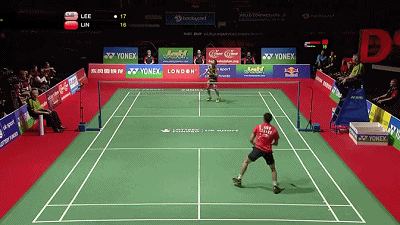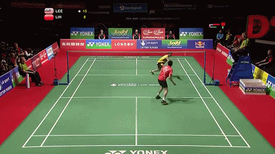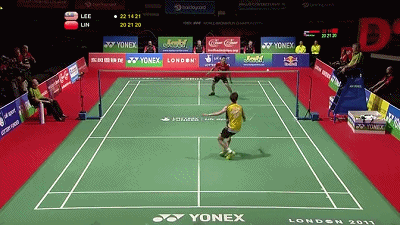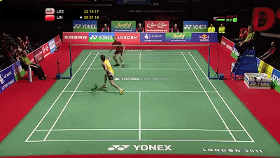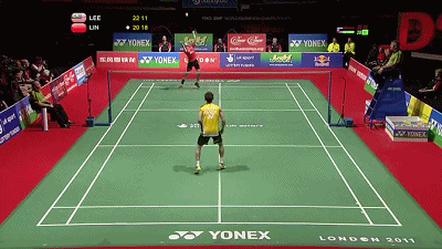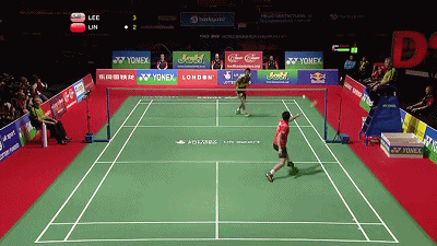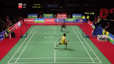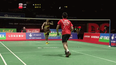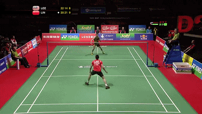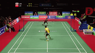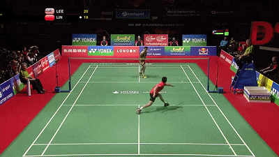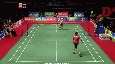 林丹勾对角,李宗伟在网前停顿,假放真推,将球推到林丹后场,林丹迅速二次启动跨步抽球,虽然将球救回,但李宗伟正在网前等待,将球扑死,如下图: