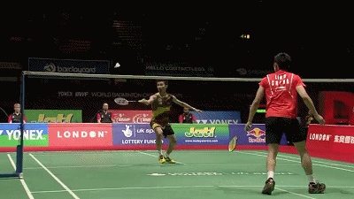 首局比赛中,林丹开局连续3个放网出界,0-3落后;之后李宗伟挂网失误,李宗伟挑林丹正手后场,林丹一个重杀砸地得分;如下图:
