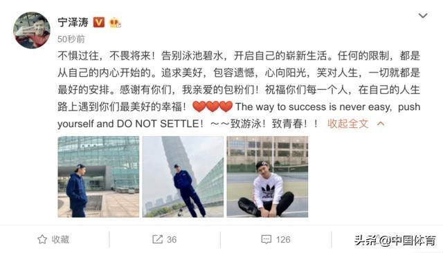 宁泽涛在自己的社交媒体上写道:“不惧过往,不畏将来!告别泳池碧水,开启自己的崭新生活。任何的限制,都是从自己的内心开始的。追求美好,包容遗憾,心向阳光,笑对人生,一切就都是最好的安排。感谢有你们,我亲爱的包粉们!祝福你们每一个人,在自己的人生路上遇到你们最美好的幸福![心][心][心] The way to success is never easy, push yourself and DO NOT SETTLE!~~致游泳!致青春!!”
