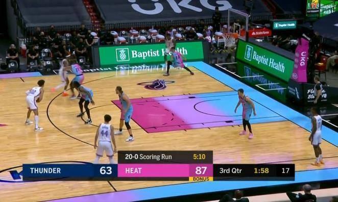 直播吧1月5日讯 热火vs雷霆,在第三节雷霆开始打出了一波小高潮将分差迫近至4分,但在末段热火在5分钟打出一波20-0,将领先优势扩大到了24分。