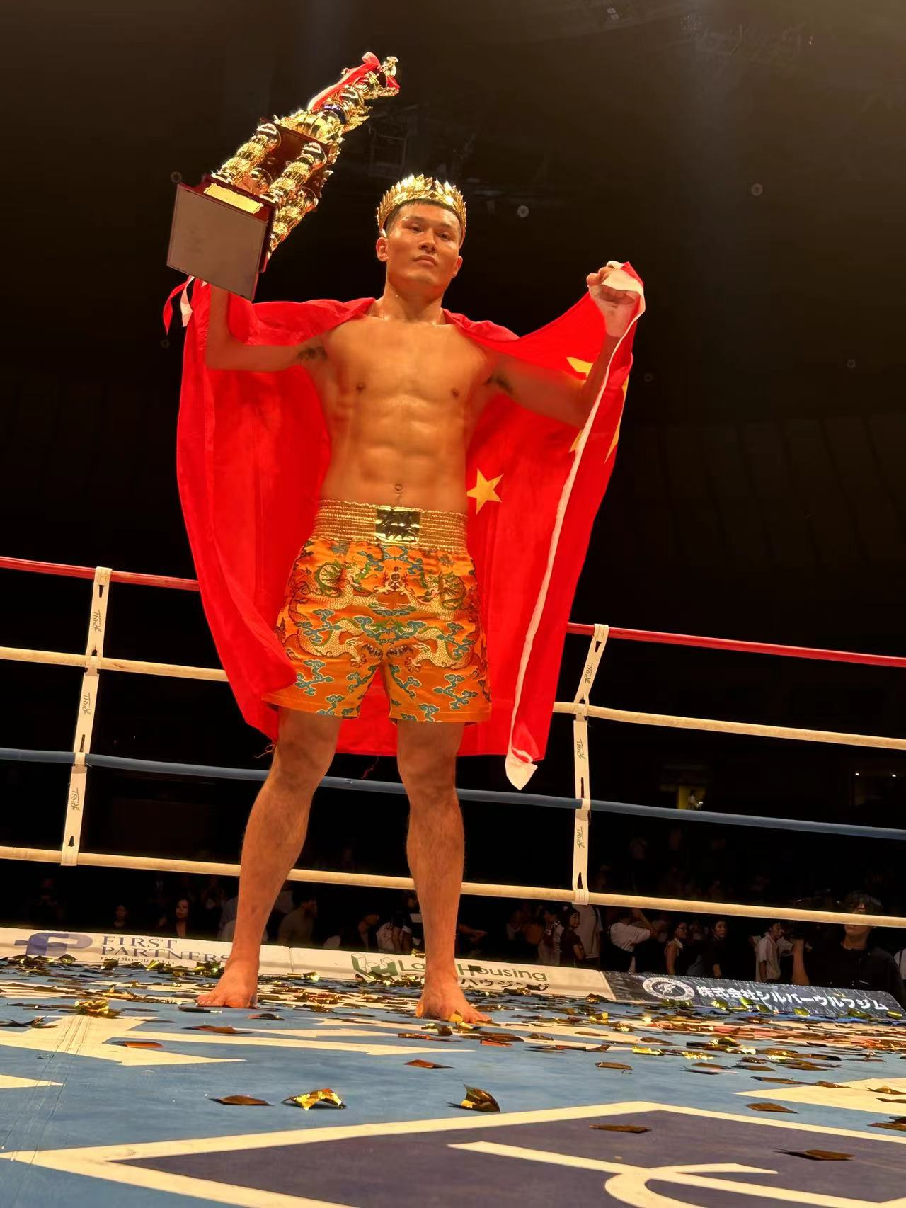 这样刘策凭借三场三次TKO的战绩获得八人赛冠军,赛后他身披国旗接受奖杯和金冠进行讲话,同时感谢教练魏锐和唐山文旅集团骁骑格斗进化营的培养。
