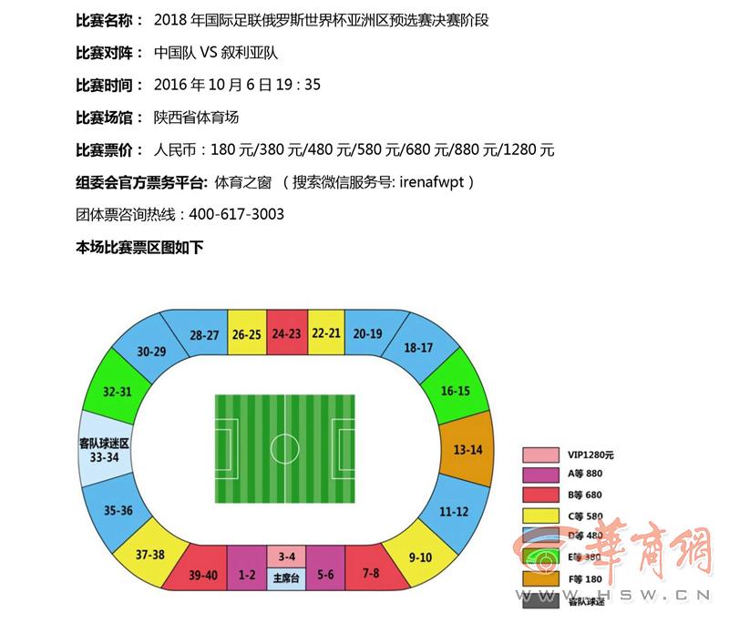 据中国福特宝足球产业发展公司总经理董铮介绍,本场比赛门票共有180元、380元、480元、580元、680元、880元六档,另有1280元的VIP票。球票将于9月21日中午12:00正式开始发售,球迷们可通过体育之窗微信服务号(irenafwpt)、永乐票务、懂球帝APP商城以及阿里体育天猫“阿里体育票务旗舰店”进行线上购票。线下购票渠道设在陕西省体育场东侧永乐票务售票窗口,具体售卖时间以组委会通知为准。