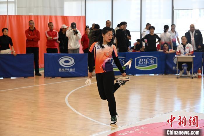 1月14日,在京津冀毽球邀请赛比赛现场,运动员们进行个人规定动作(盘踢)、集体接力计数赛、健身毽球男女混合五人围踢等9个项目的比赛。 耿辉 摄