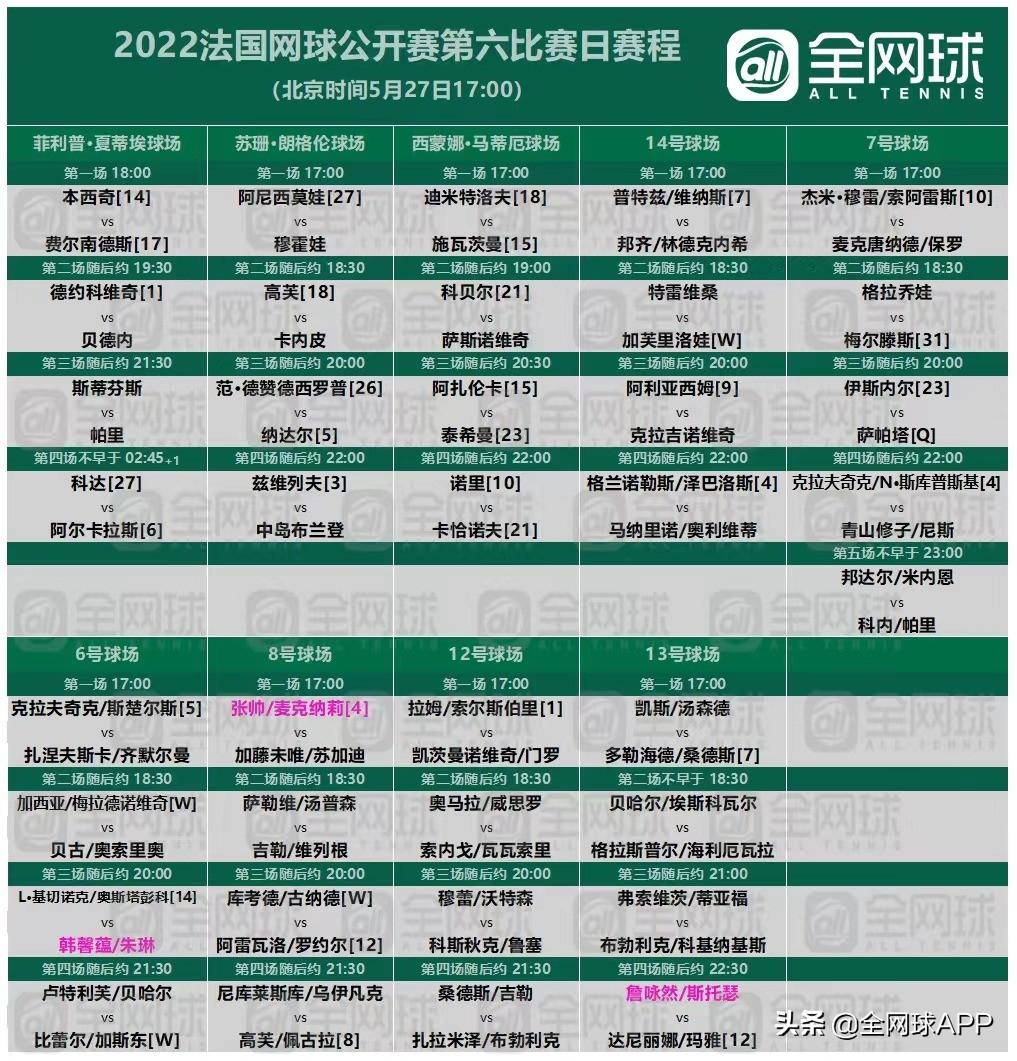 温馨提示:巴黎与北京有6小时时差,每天第一场比赛为北京时间17:00。中央电视台体育频道、腾讯体育与企鹅直播都将转播本届法网。此外,全网球APP将全程报道2022法网,为各位提供签表、赛程赛果、战报。