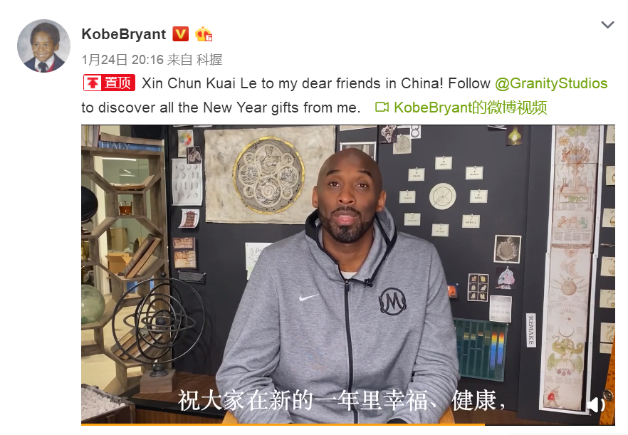 这段微博还配了科比本人录制的一段祝福视频。他在视频中说:“新年快乐,我亲爱的中国朋友们!感谢大家过去一年里对我的支持,你们通过自己的努力,让我看到了你们身上的激情和专注……祝大家在新的一年里幸福、健康,并发现自己的内心魔力,在鼠年取得更好的成绩。爱你们的科比。”