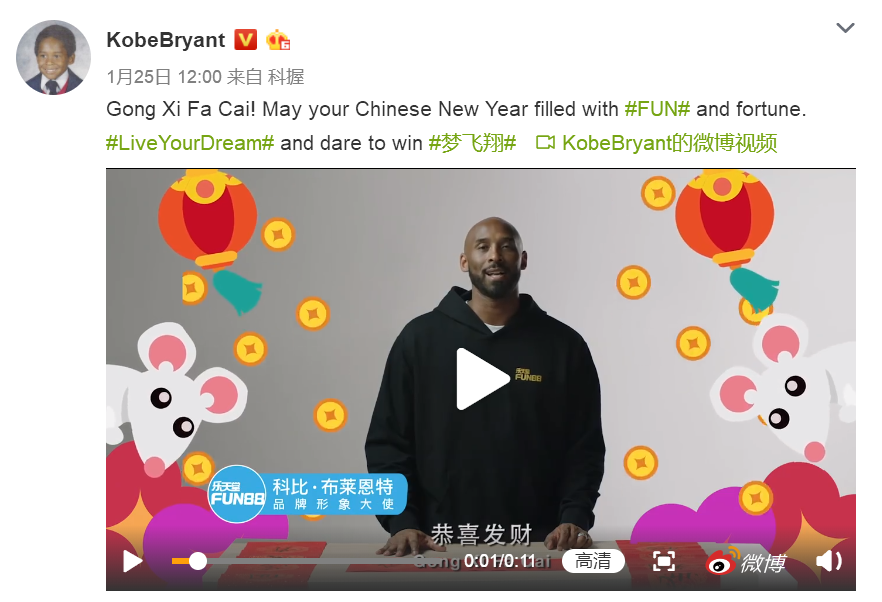 1月24日,科比用英语和汉语拼音发微博说:“新春快乐,献给我亲爱的中国朋友们!(Xin Chun Kuai Le to my dear friends in China! )”