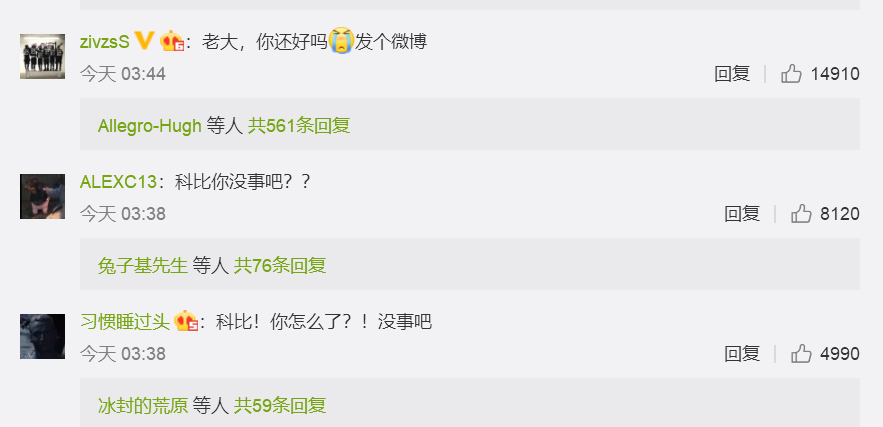 在科比去世的消息传来后,许多中国网友纷纷在上述微博下留言,表达对一代巨星离世的哀悼和不舍。