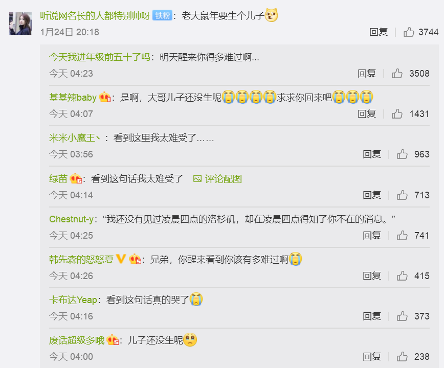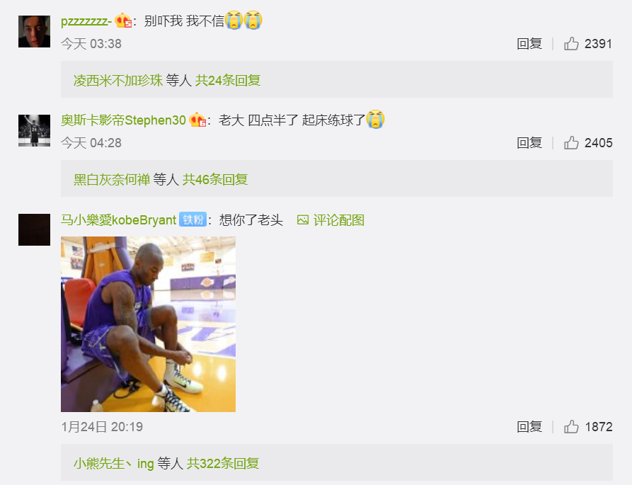 在网友一串悼念留言中,我们还看到24日当晚一位中国网友的留言:“老大(指科比)鼠年要生个儿子。”许多网友在这条留言下说,“看到这句话,我太难受了”,“真的哭了”。