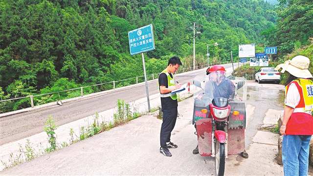 开州香肠队队员陈斌(左一)正在鹤林村进行交通安全劝导。记者 刘冲 摄/视觉重庆