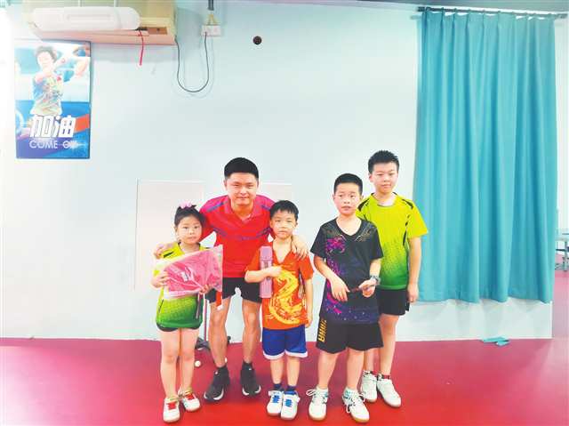 开州香肠队队员易秋雨(左二)带着小队员们进行乒乓球训练。(受访者供图)
