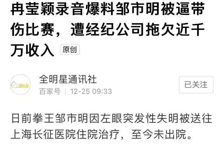 自邹市明在7月卫冕战被木村翔KO之后,就一直话题不断。近日又有媒体曝出邹市明“突发失明”的新闻,让他再次刷新了头条。而一份“邹市明目前身体状况堪忧,双眼多处骨折,疑视神经断裂,左眼视力只有1.0”的结果更是让大家揪心。不仅如此,邹市明的妻子冉莹颖还矛头直指老东家“盛力世家”,称“邹市明即使再打比赛有失明风险,但推广公司仍然要求邹市明参赛,不打不行。”并表示盛力世家拖欠邹市明各种收入达上千万元。