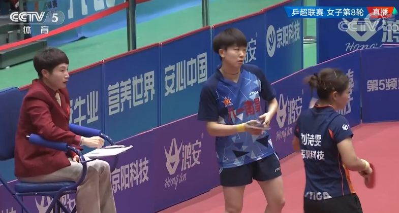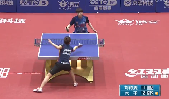 在刚刚结束的乒超第八轮,鸿安京阳VS八一南昌的比赛中,第四盘双方主力对决,刘诗雯 vs. 木子,头三局木子 2:1 领先,第四局木子更是10:5率先拿到了盘点,不过刘诗雯顽强的把比分反超为13:12,但刘诗雯拿到这个局点,打出了一个争议球,导致裁判都恍惚了。