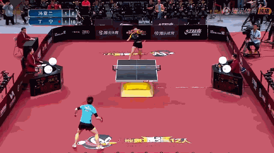 比赛第三局拿到局点的丁宁长球发到弗亚兰反手,弗亚兰反手快撕丁宁正手,丁宁正手变直线,弗亚兰勉强将球打回,丁宁加力大角度斜线,洪亚兰被动防守挑高球,丁宁继续攻击反手,被动中洪亚兰侧身反拉,丁宁丝毫没有慌张,正手高质量拉球攻击中路,洪亚兰继续反拉,但质量一般,丁宁瞅准机会突然变直线,洪亚兰立刻弓箭步前冲,同时右手虽然勉强将球救回,但是球台前留下了大片的空档,而丁宁等的就是这个机会。