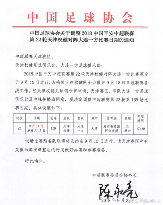 由于电视转播方面的需要,在征求了天津赛区及参赛双方俱乐部意见后,本场比赛已经调整开球时间,由9月30日19:35提前至当天17:30。(津云新闻记者时青华)
