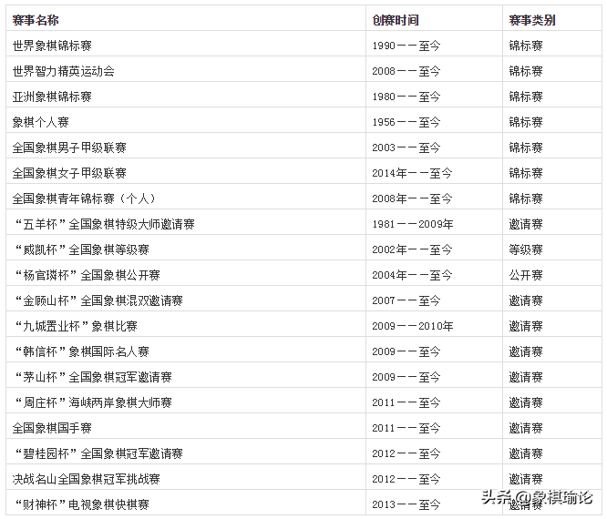 上世纪五十年代以来覆盖面较广,参与人数较多,影响力较大的象棋比赛整理如表: