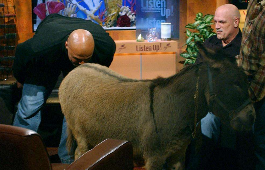 有道是“言必出行必果”,能用行动去证明自己说过的话,这才是大丈夫所为。当年巴克利并不看好新秀时期的姚明,在一次节目中表示如果姚明能得到至少19分就去亲自己搭档史密斯的屁股!仅仅两天之后,姚明就在面对奥尼尔的比赛中9投全中看下20分!于是巴克利在全国观众面前,牵来了一头驴,然后结结实实地亲在了驴屁股上!而这一幕,也成为NBA历史上最搞笑的镜头之一。(Repo)