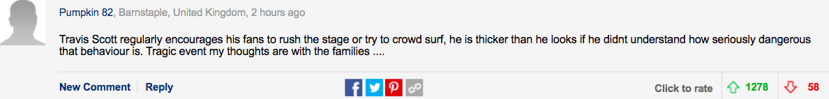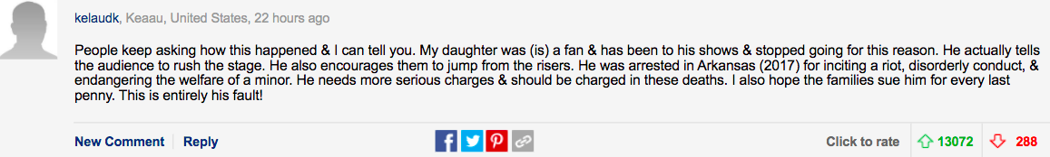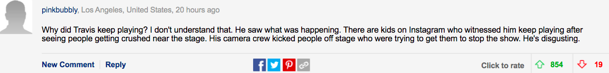 “特拉维斯经常鼓动粉丝冲上台或者玩‘人浪’。如果他不明白这是多危险的行为,脸皮真是太厚了。悲剧事件,为那些家属祈祷。”