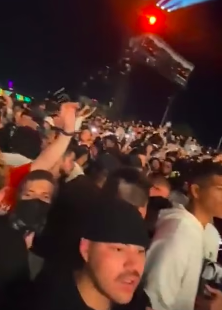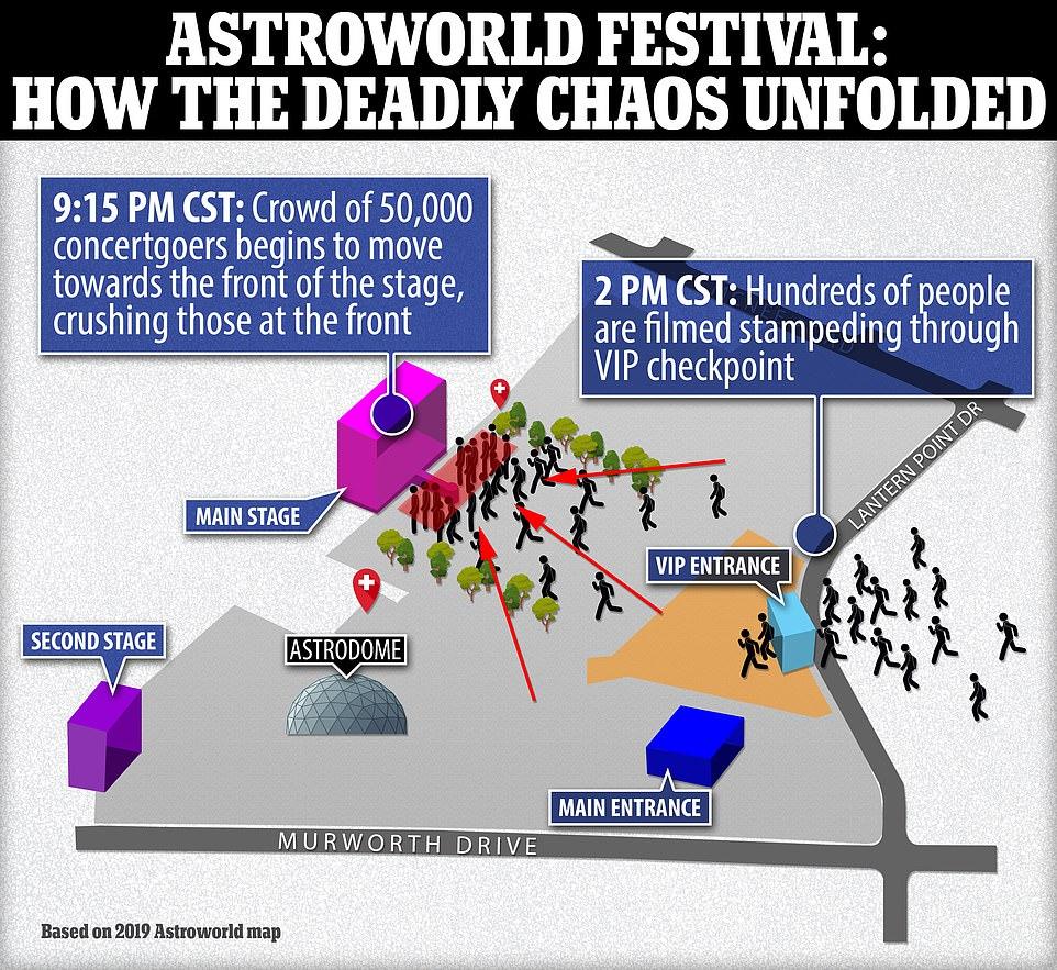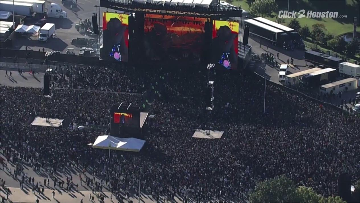 这时,特拉维斯依然没把舞台前发生的惨剧当一回事,而是继续让大家蹦起来high起来。音乐声轰鸣,盖住了越来越多前方被挤观众的求救声。