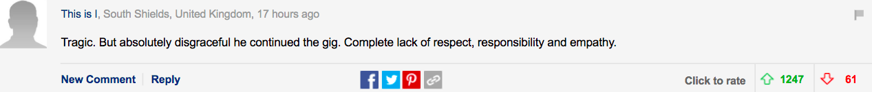 “悲剧。他无视这些继续表演真的很没品,毫无尊重、不负责任、没有同情心。”