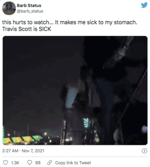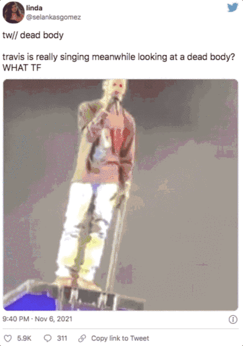 “为什么他要继续表演?我不明白。他看到发生了什么,ins上有孩子看到特拉维斯看到有人被挤在舞台下面,却依然继续唱歌。他的摄影团队把想阻止表演的人踢下了舞台。他真恶心。”
