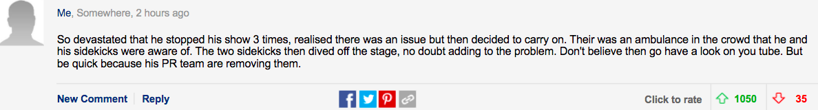 “他发声明说自己很悲痛,结果是暂停3次,知道台下有问题了但依然选择继续。人群里都来了一辆救护车,他和身边两个伴舞都知道。然后两个伴舞跳下舞台,无疑是火上浇油。不信的话去快去油管看看,因为他的公关团队在删视频。”