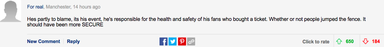 “他要被谴责,这是他的演唱会,该负责买票粉丝的健康和安全。不管人们闯不闯护栏,都应该更安全才行。”