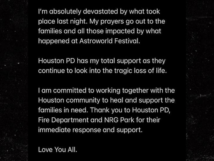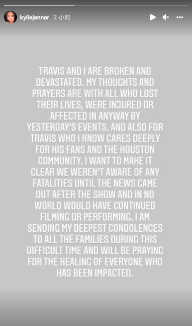 事发后,特拉维斯在自己的推特上和ins上都发表声明,表示对昨晚发生的惨剧感到极为悲痛,为受害者和伤者祈祷。他还说,正在和休斯顿警方合作,将会尽力帮助受影响观众的家庭。