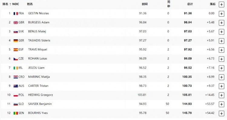 英国选手博格斯用时96.84拿到银牌,斯洛伐克的贝努斯获得一枚铜牌。