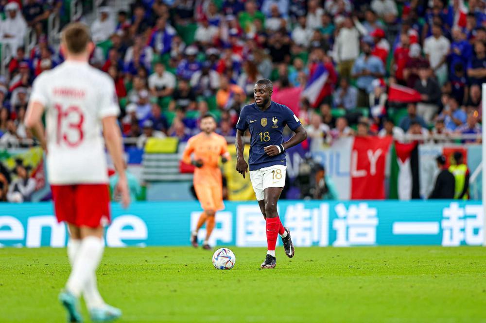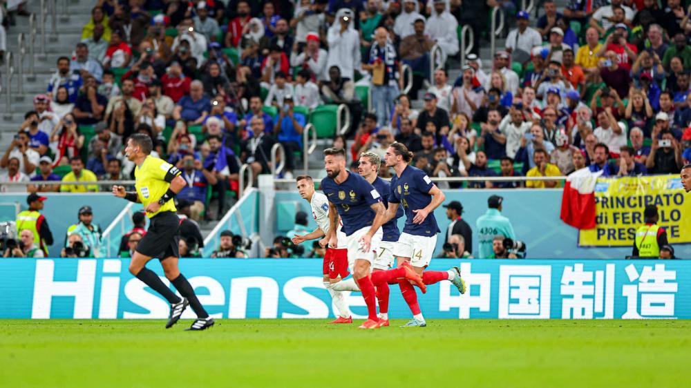 第44分钟,法国队前场组织攻势,姆巴佩斜塞,吉鲁禁区内半转身左脚低射得手,法国1:0波兰。
