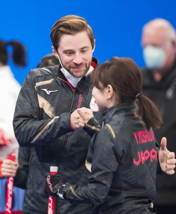 ↑2月18日,日本队教练詹姆斯·道格拉斯·林德赛前与日本队选手吉田夕梨花击掌。