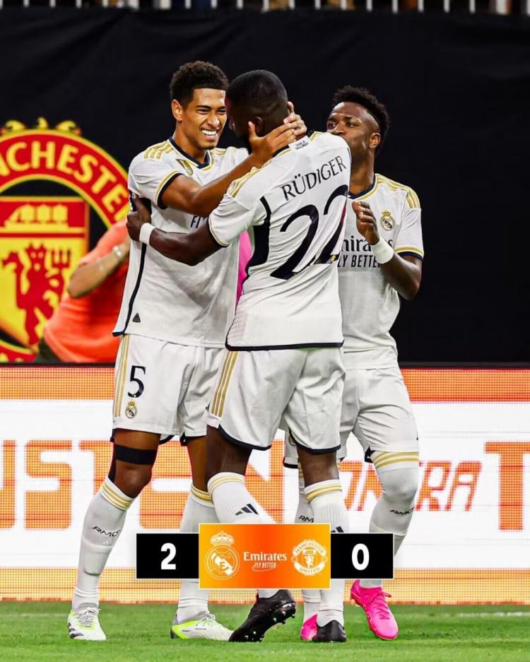 直播吧7月27日讯 北京时间今天早上8:30,皇马与曼联友谊赛。奥纳纳上演曼联首秀。上半场贝林厄姆打进皇马生涯处子球,梅努伤退。易边再战双方先后大面积更换球员,何塞卢打进石破天惊的倒钩进球,收获回归首球。最终皇马2-0曼联收获热身赛两连胜。