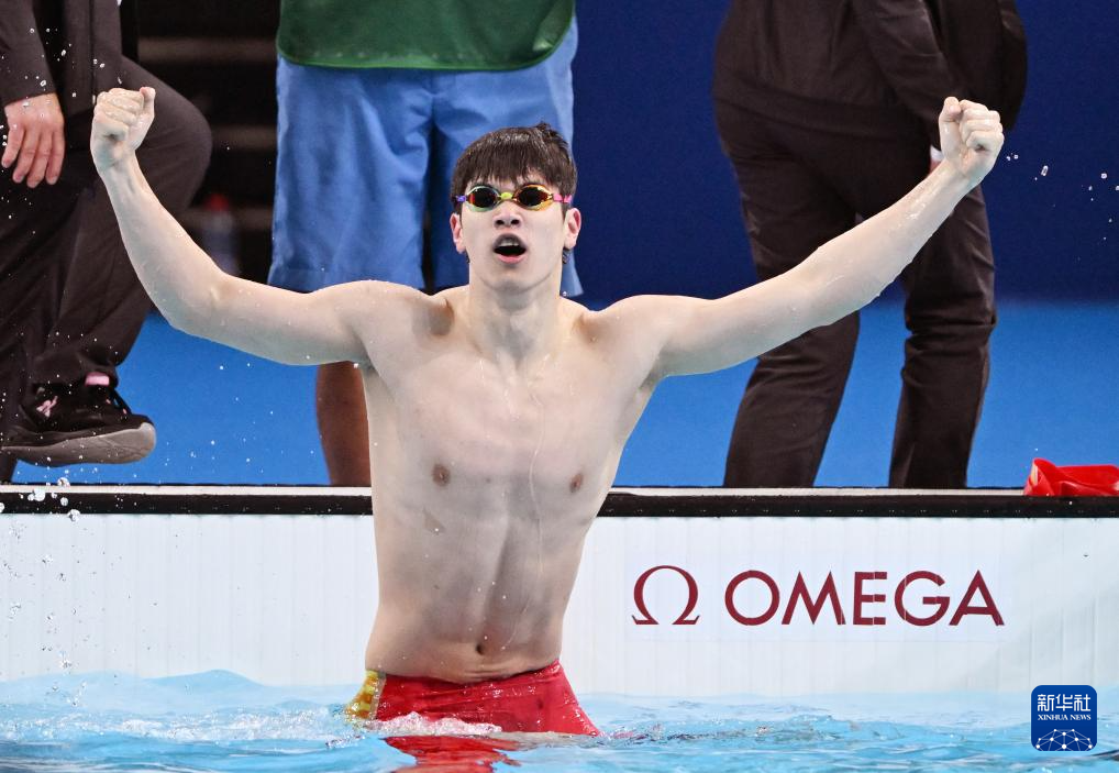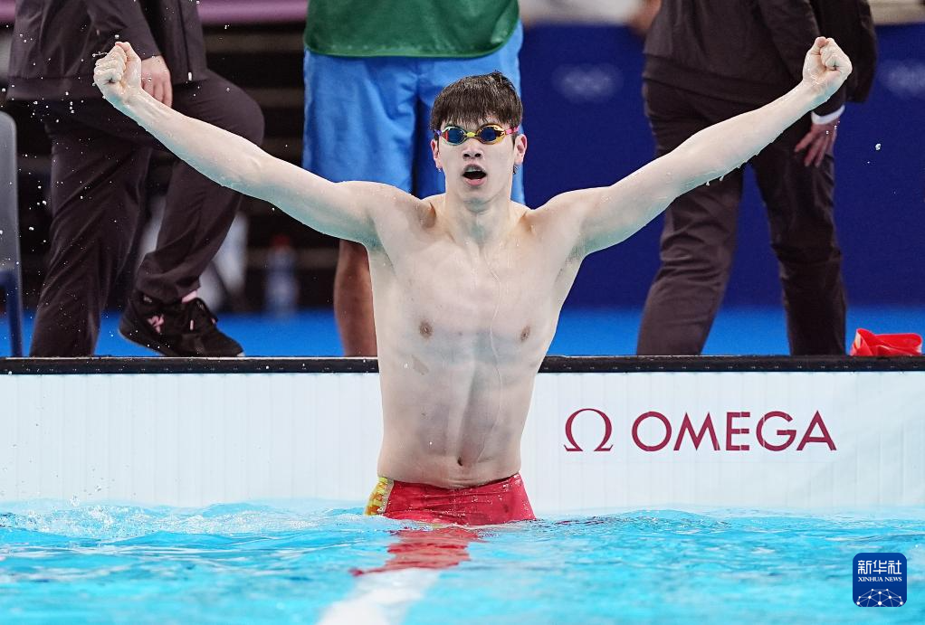 7月31日,中国选手潘展乐(前)庆祝夺冠。新华社记者 王毓国 摄