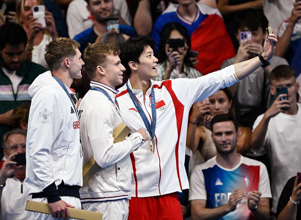 8月2日,冠军法国选手马钱德(中)、亚军英国选手斯科特(左)、季军中国选手汪顺在颁奖仪式上自拍。