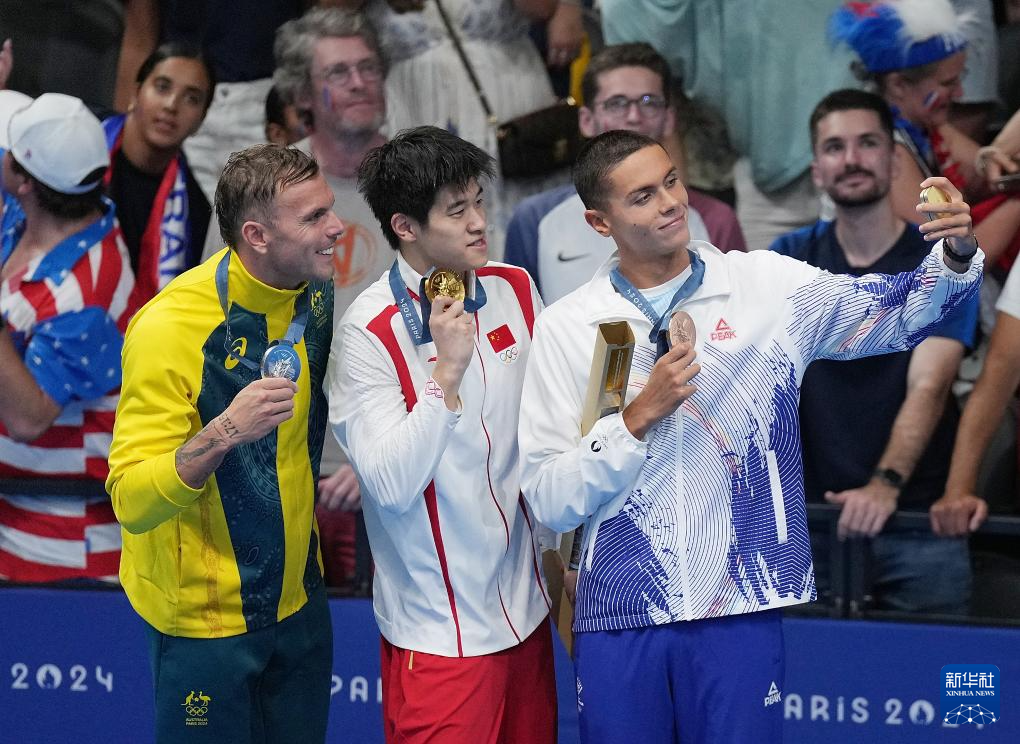 7月31日,冠军中国选手潘展乐(中)、亚军澳大利亚选手查默斯(左)与季军罗马尼亚选手波波维奇在颁奖仪式后。新华社记者雒圆 摄