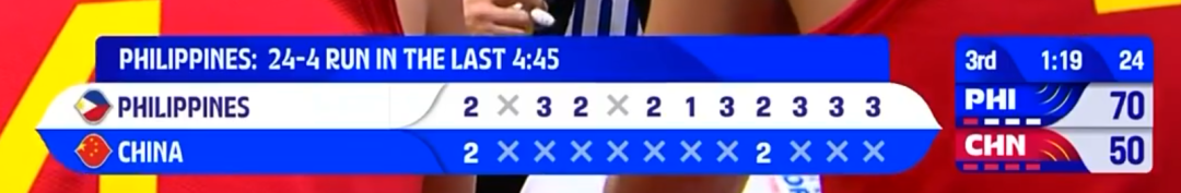 第三节比赛结束,菲律宾73-51大比分领先,单节净胜23分……第四节比赛,就此失去悬念。