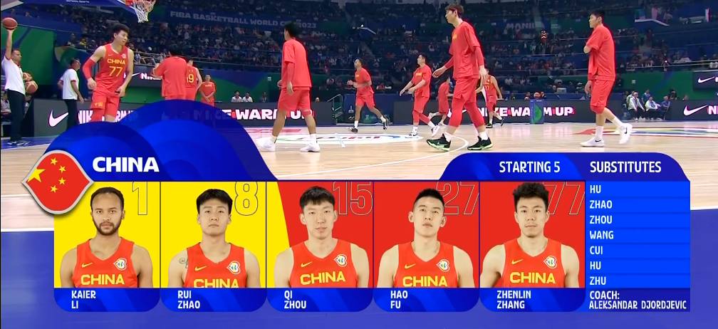 本场比赛,中国男篮沿用了上一场的策略,派出赵睿、张镇麟、付豪、李凯尔和周琦的首发阵容。