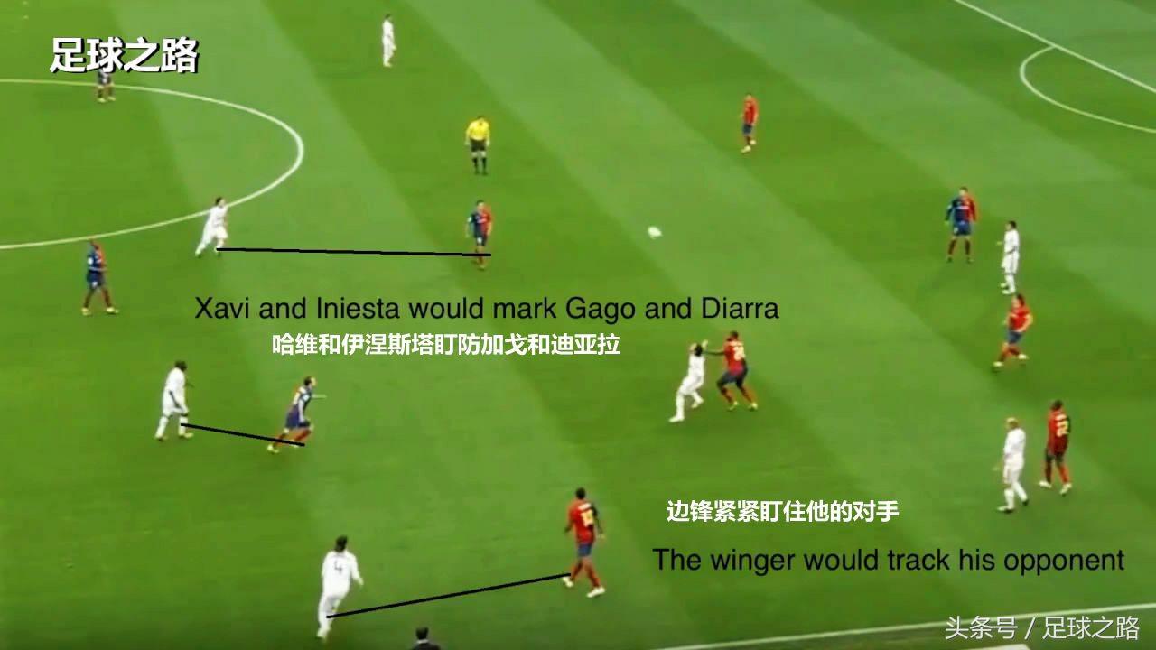 巴萨则采用区域防守的方法,人人在自己的区域严阵以待,时刻紧盯进入自己区域的对手。哈维和伊涅斯塔盯防加戈和迪亚拉,边锋紧紧盯住他的对手;